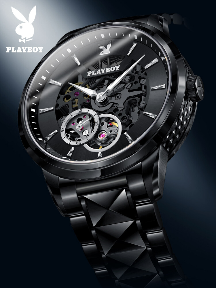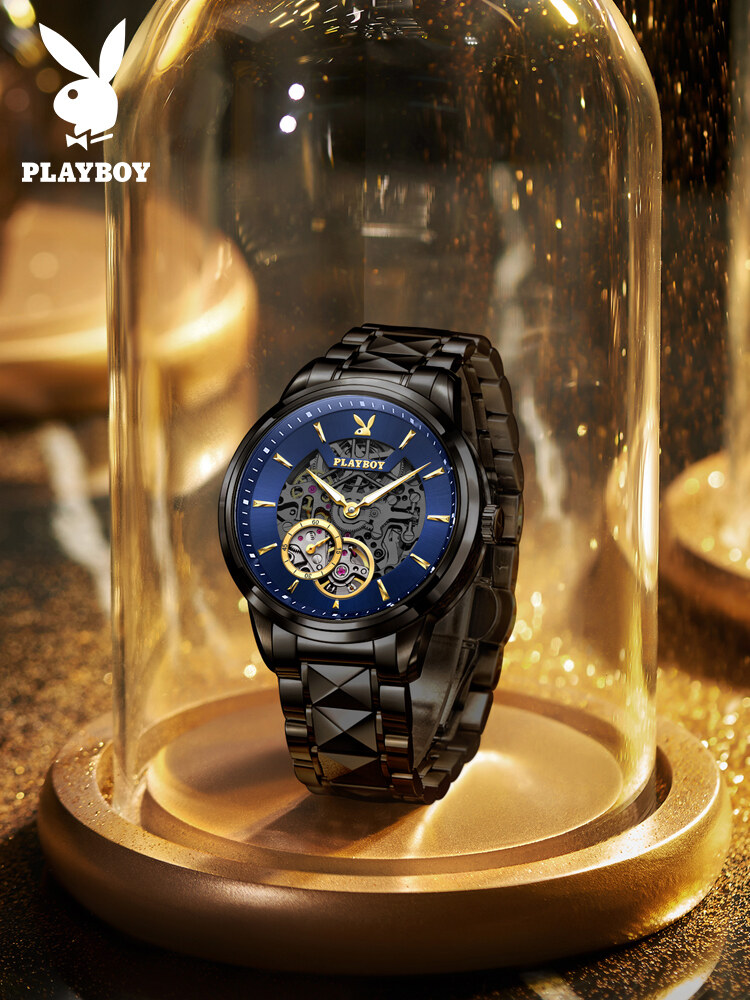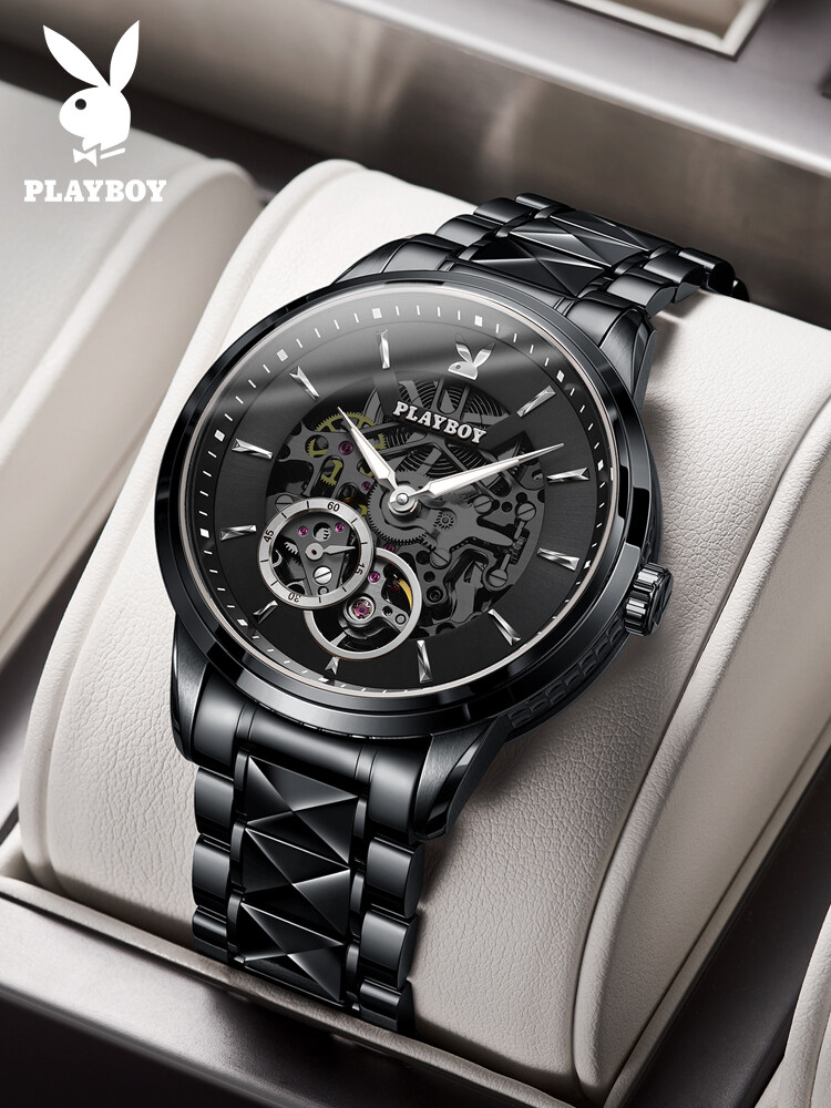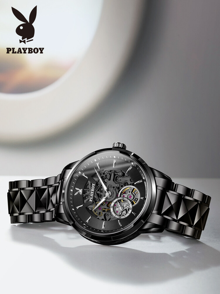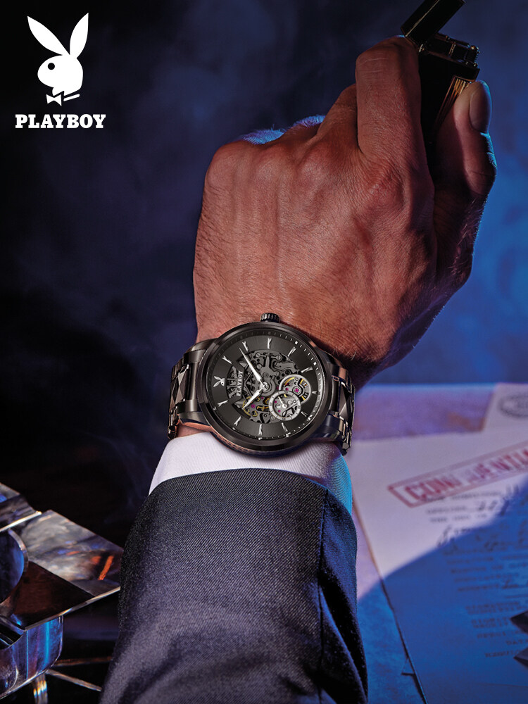 PLAYBOY Luxury Movement Automatic Mechanical Watch For Men 2021 New USA Double-sided Perspective Stainless Steel Strap Watch Waterproof Luminous Display