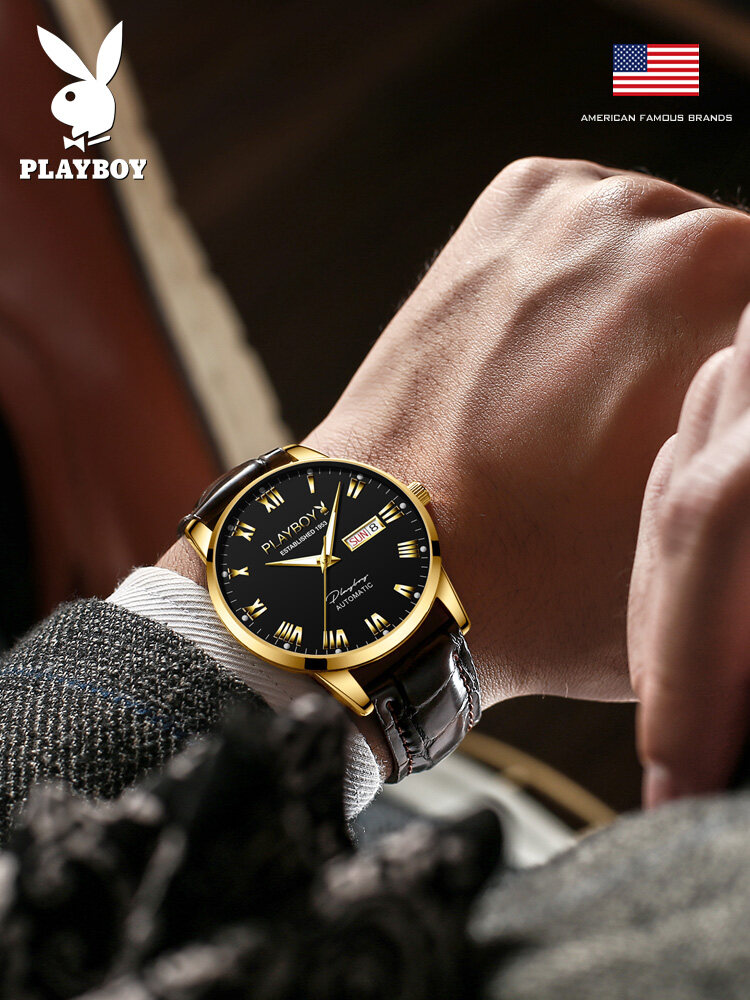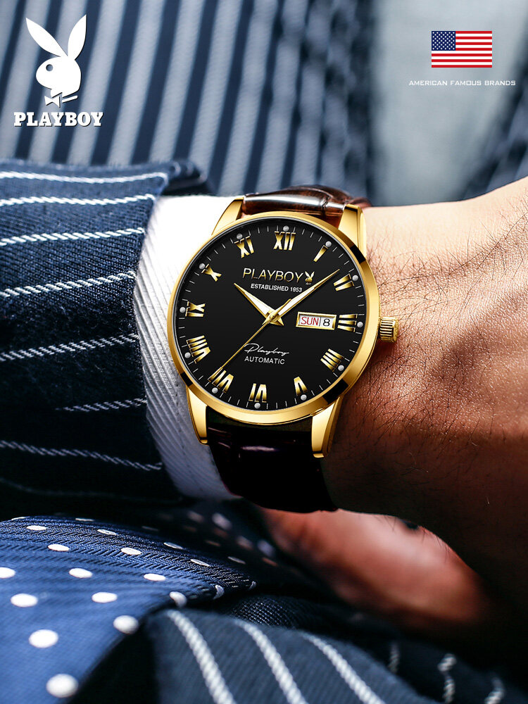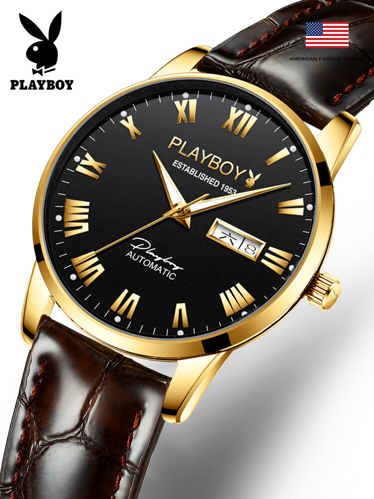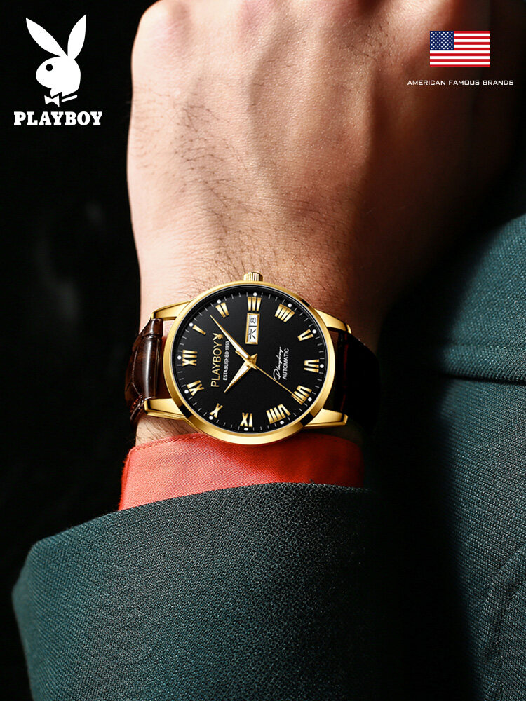 PLAYBOY Gentleman Watch For Men Automatic Mechanical American Brand Swiss Certified Movement Fashion Leather Strap Waterproof Dual Calendar Display