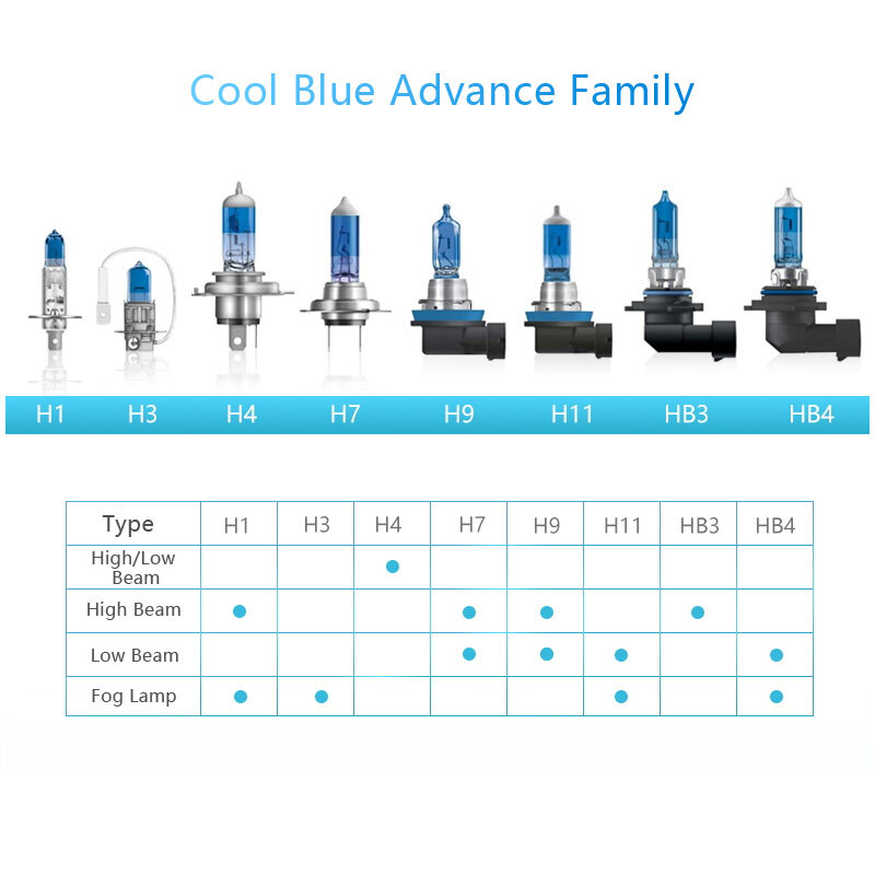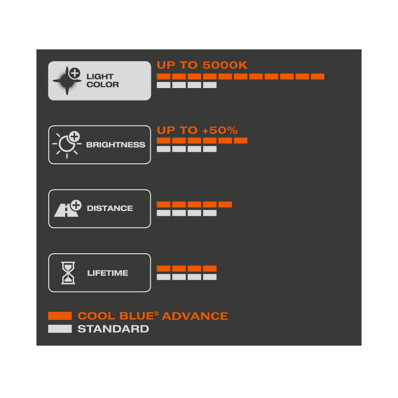 Seeking the ultimate in style but don’t want to compromise on brightness? Choose the new OSRAM Cool Blue Advance. The range produces a colour temperature of up to 5000K, plus delivers up to 50% extra brightness on the road than standard. Choose OSRAM Cool Blue Advance and you’ll benefit from the best of both worlds: a stylish, white light with extra light output.