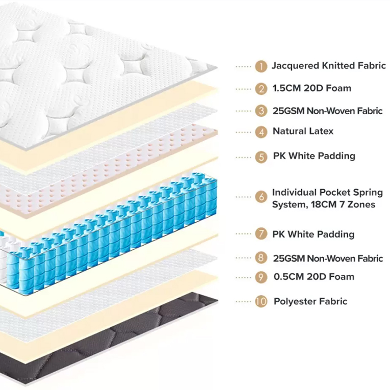Individually wrapped pocket springs that allow you to change position without disturbing your partner.A 1cm thick layer of latex and foam provides high pressure-relieving capacity, enabling your body to relax more fully.The pocket springs are individually wrapped to insulate movements so you don't disturb your bed partner.A generous layer of soft fillings adds support and comfort.