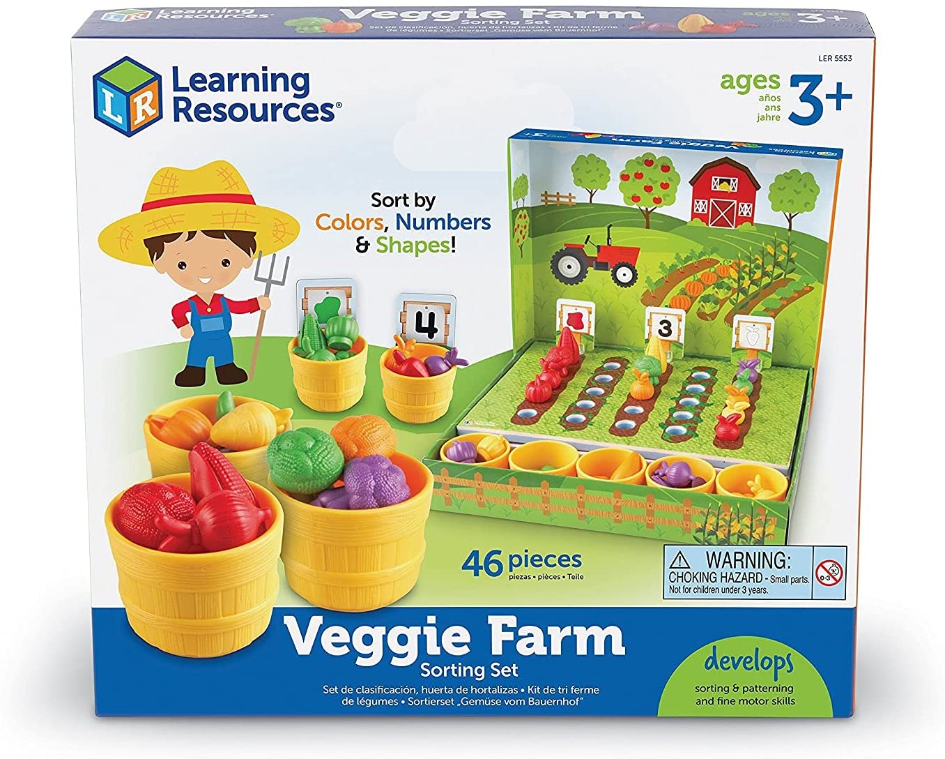 Your kids can grow their own skills and abilities in the playful fields of the Veggie Farm Sorting Set from Learning Resources. Realistic plastic vegetable figures come in five vibrant colours, and represent popular veggies including broccoli, corn, onions, pumpkins, and more. Aside from learning new veggie vocabulary, kids can use these figures, along with the included bushel baskets and soft foam playmat, to work on other real world skills. Sort the veggies by colour, count out each type of vegetable, or match the colours and shapes to the ones depicted on the playmat's farm signs. The Veggie Farm Sorting Set is a snap to clean, and folds up into a convenient carrying case for post playtime storage or on the go play. Take playsets on the go or make clean up easy with a convenient fold up carrying case. Ages 3+. Grades PreK+.