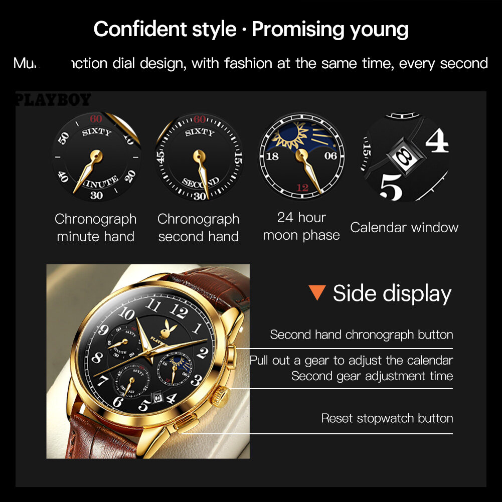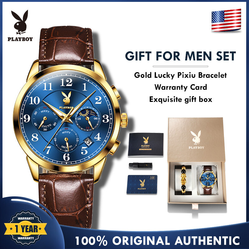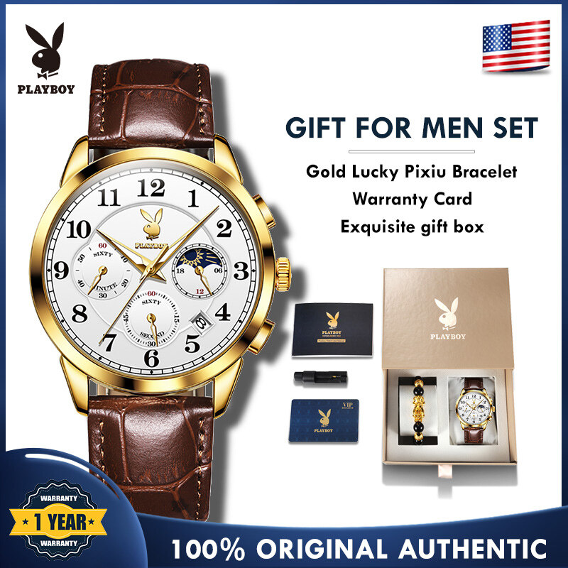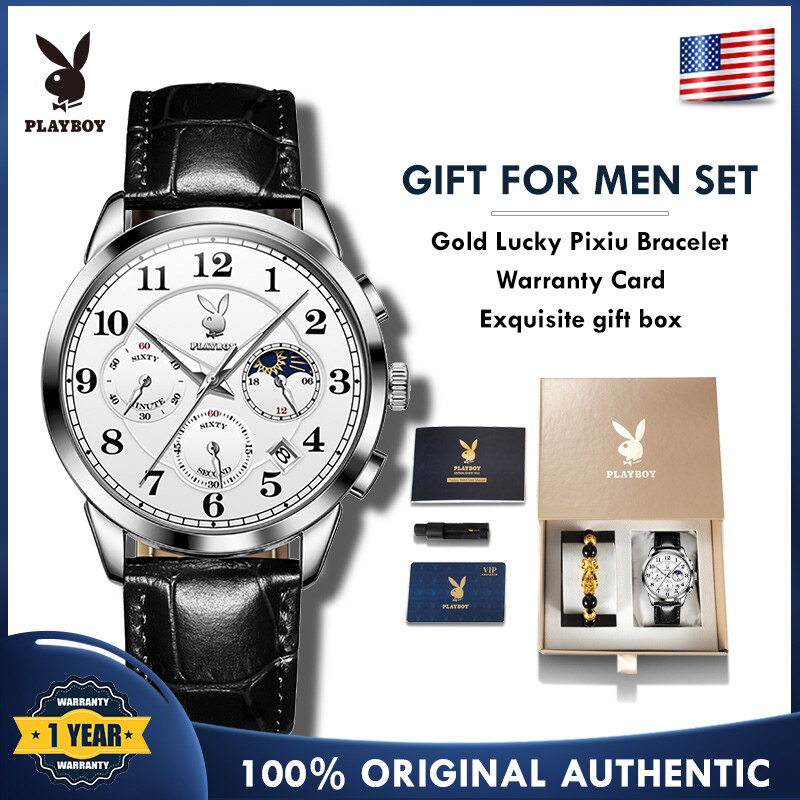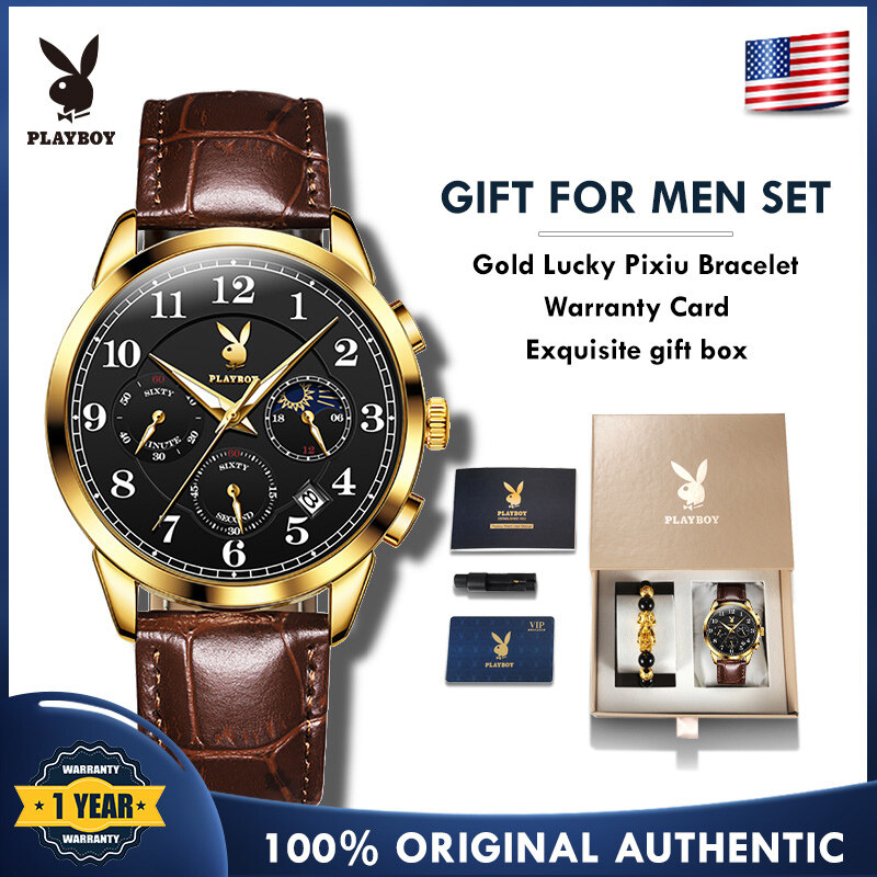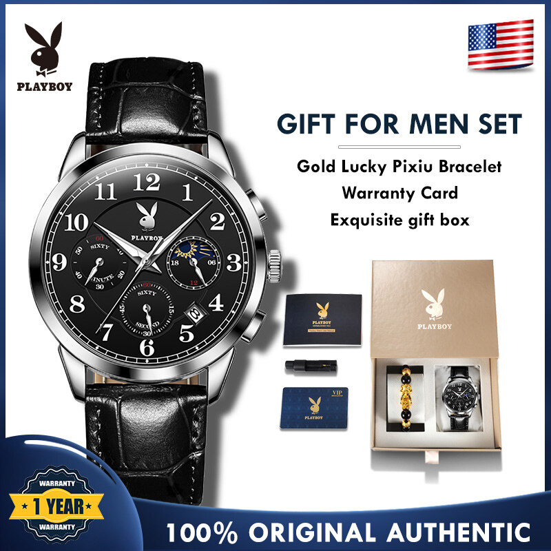 PLAYBOY Watch men Original Water proof Gift for men set with box Genuine original import Genuine Leather Japanese Movement Multifunction Watch