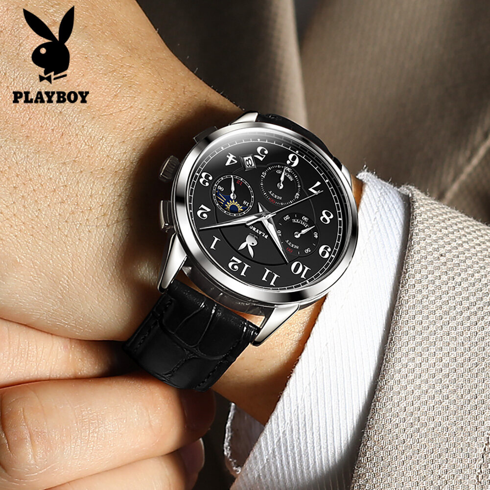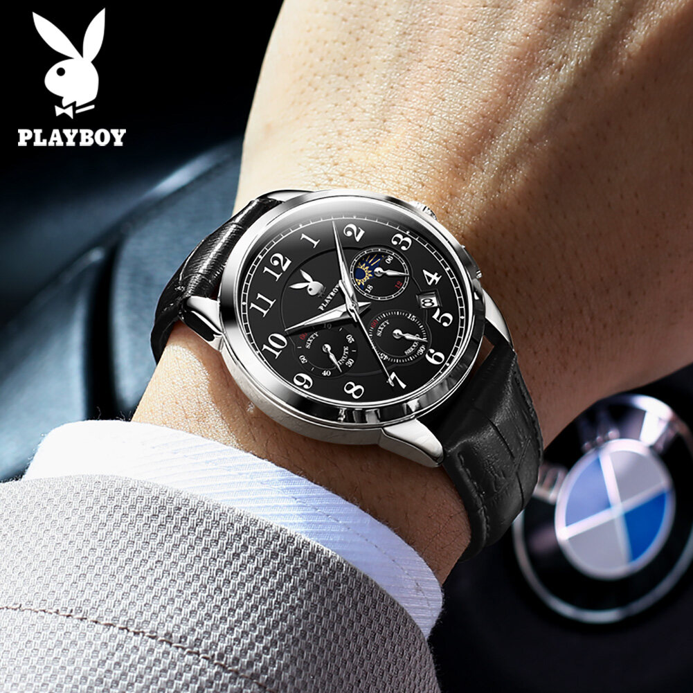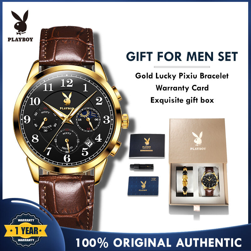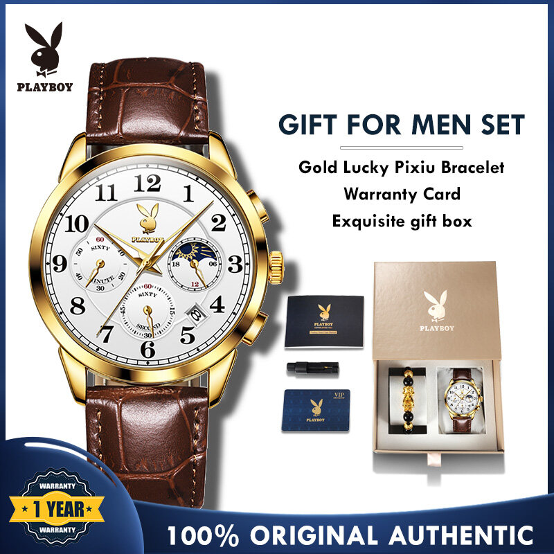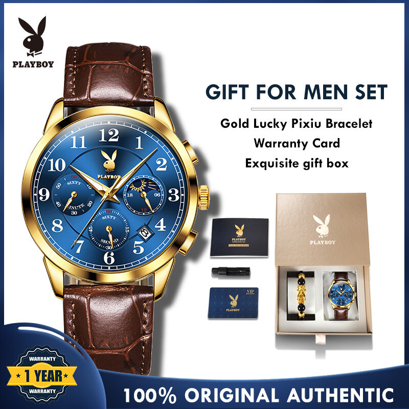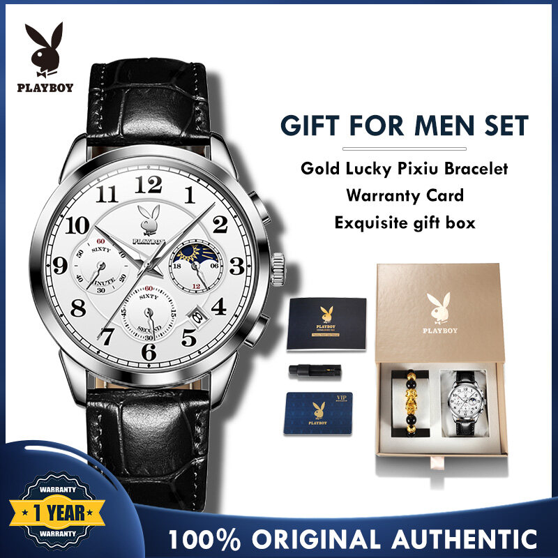 【Buy 1 Take 1】Authentic PLAYBOY Watch for Men Original Waterproof 2022 Luxury Genuine Leather Multifunction Chronograph Watch Set With Free Bracelet
