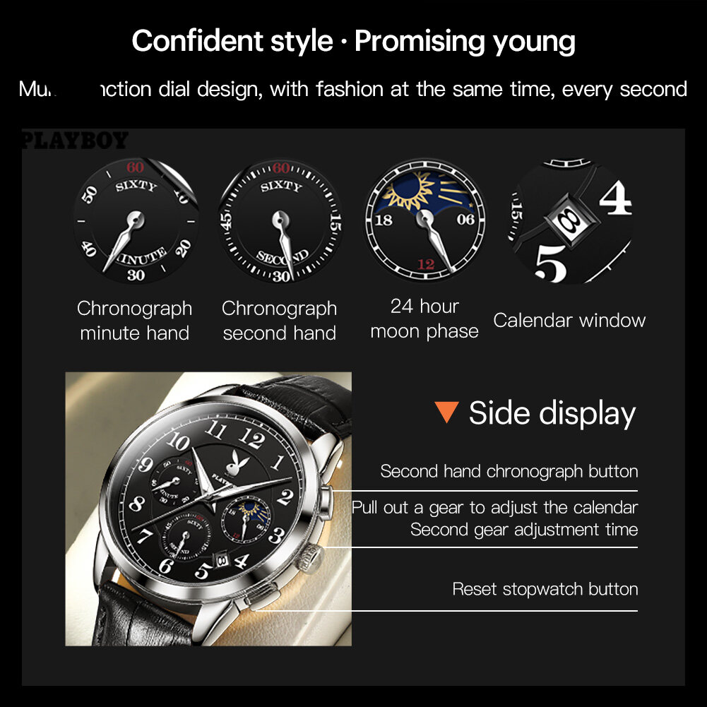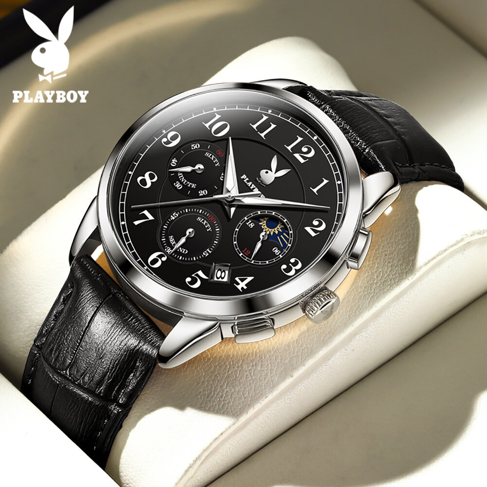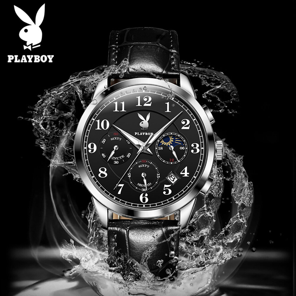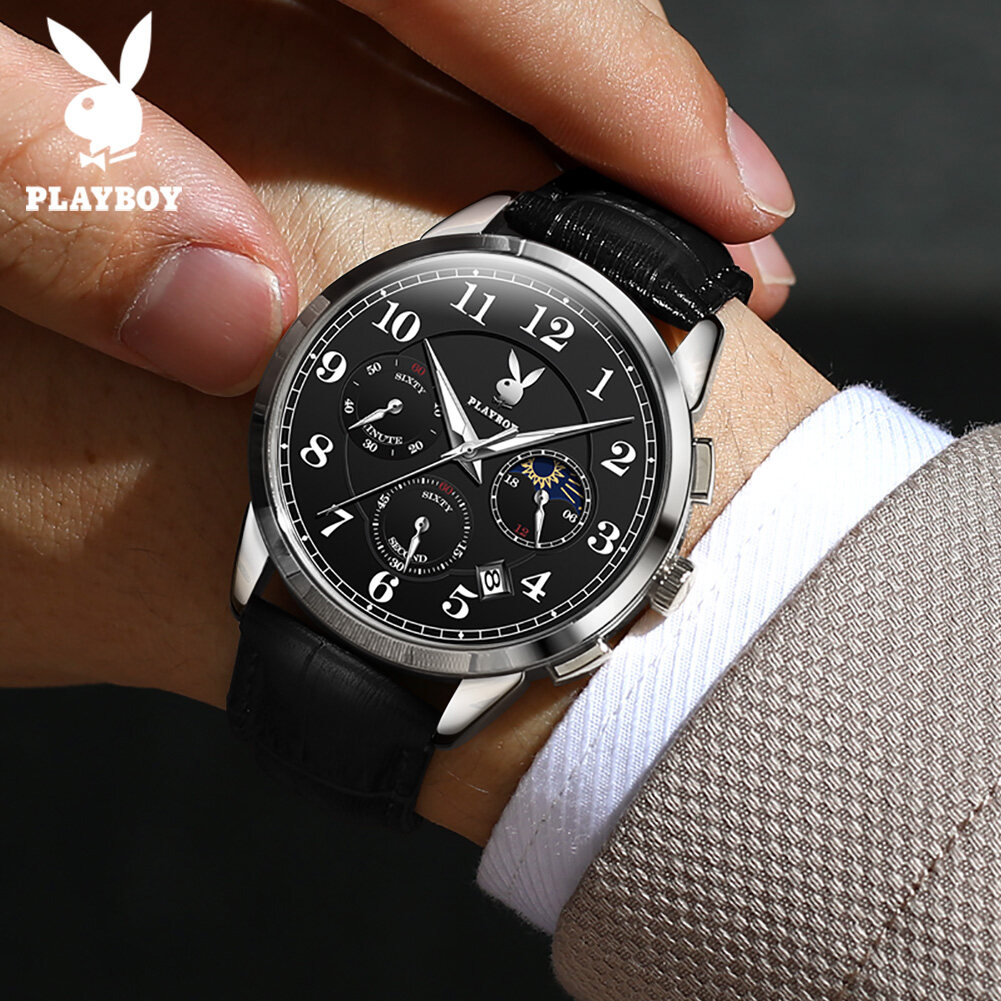 【Buy 1 Take 1】Authentic PLAYBOY Watch for Men Original Waterproof 2022 Luxury Genuine Leather Multifunction Chronograph Watch Set With Free Bracelet