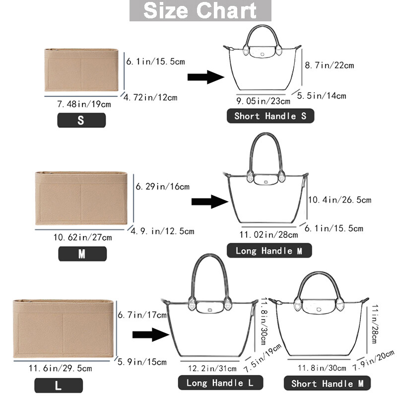 Features: It Fits perfectly and the color matches the interior really well . The felt material is super sturdy and I’m so glad I now have a way to organize my bag, add some structure and keep the interior clean. Do not invest in an expensive bag without this product! It’s a lifesaver. NEW MATERIAL & ZIPPER POCKET: Felt Purse Organizer with High quality and New Materials are made of Sturdy ,Soft and pliable, Lightweight Felt fabric.The Zipper of the organizer are made of Metal, Durable, Fashion and smoother Improve space and bid farewell to clutter Serves for LONGCHAMP Bag, keep your handbag look beautiful and in order, it is easy to change purses and bags throughout the day without having to rearrange. Multi pocket organizer pockets, easy organizers your cosmetics, smartphone, glasses, travel items etc. PLS CHECK the SIZE CHART before PURCHASING IT!!!Please kindly Measure the Interior Length, Width and Height of Your Handbag with a Measuring Tape.