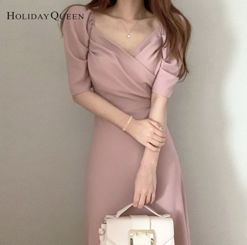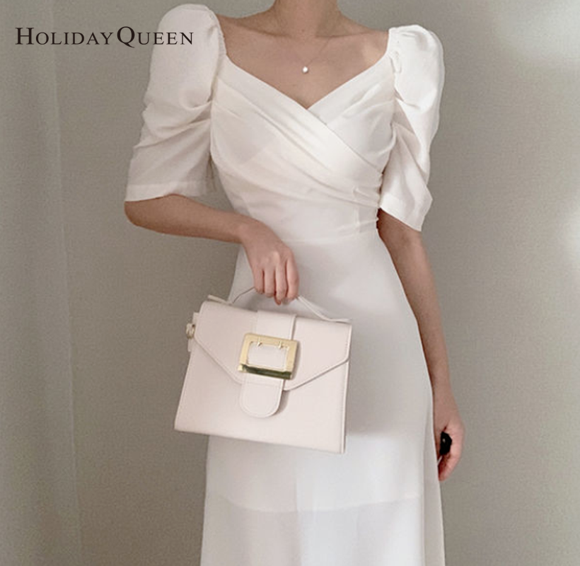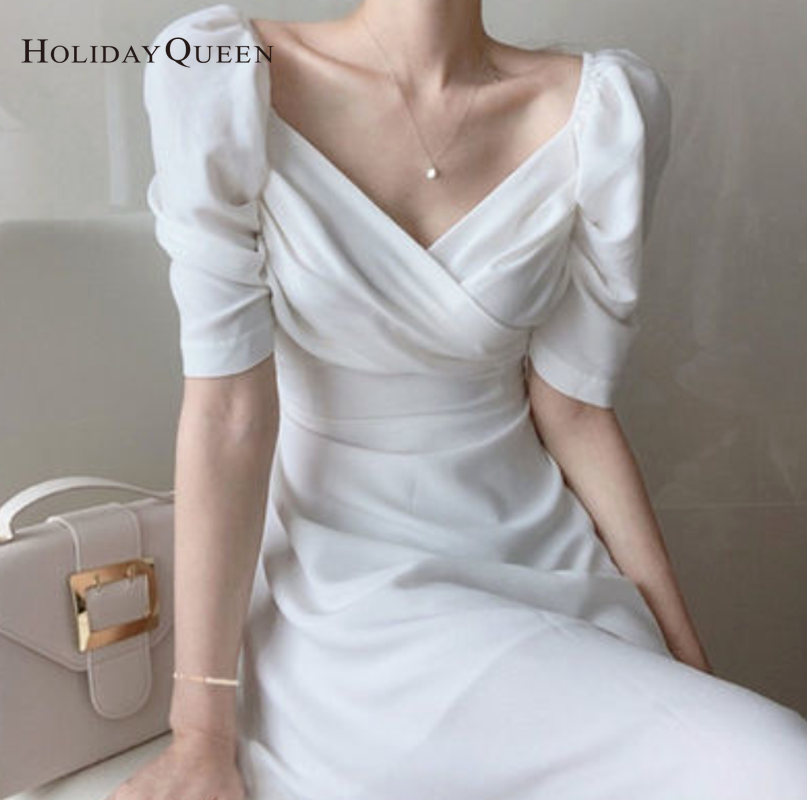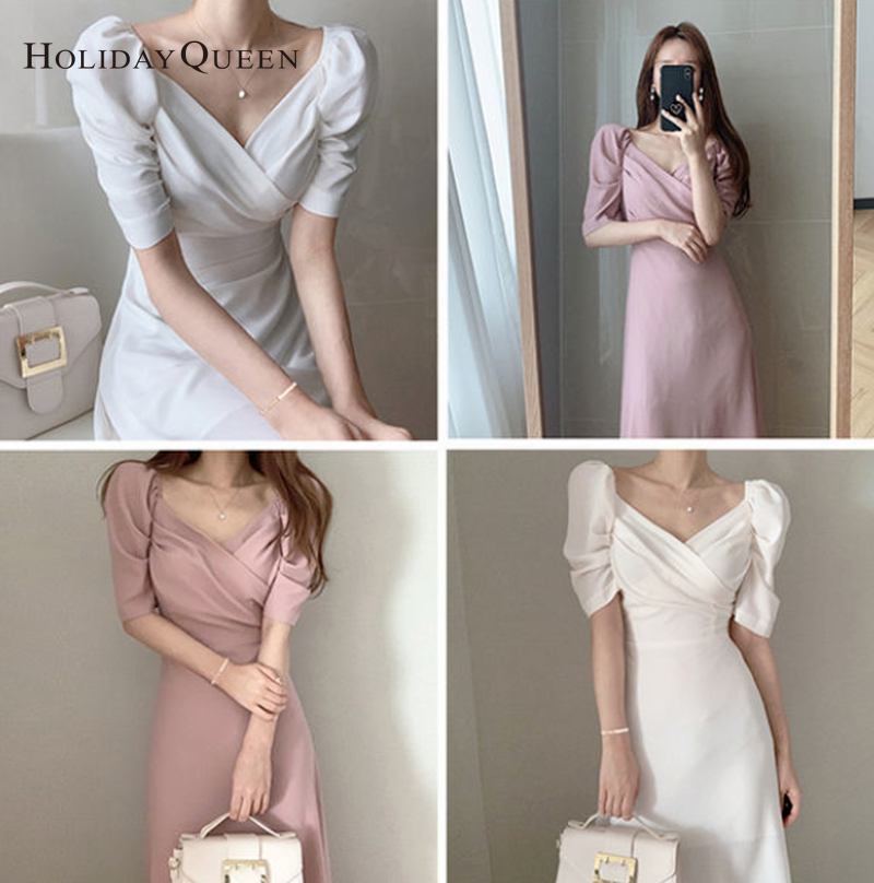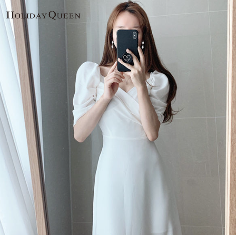 HolidayQueen Summer Korean Chic French Style Is Thin V-neck Careful Machine Waist Puff Sleeve Chiffon Dress Long Skirt Goddess Fan S M L XL Free Shipping HQP1001
