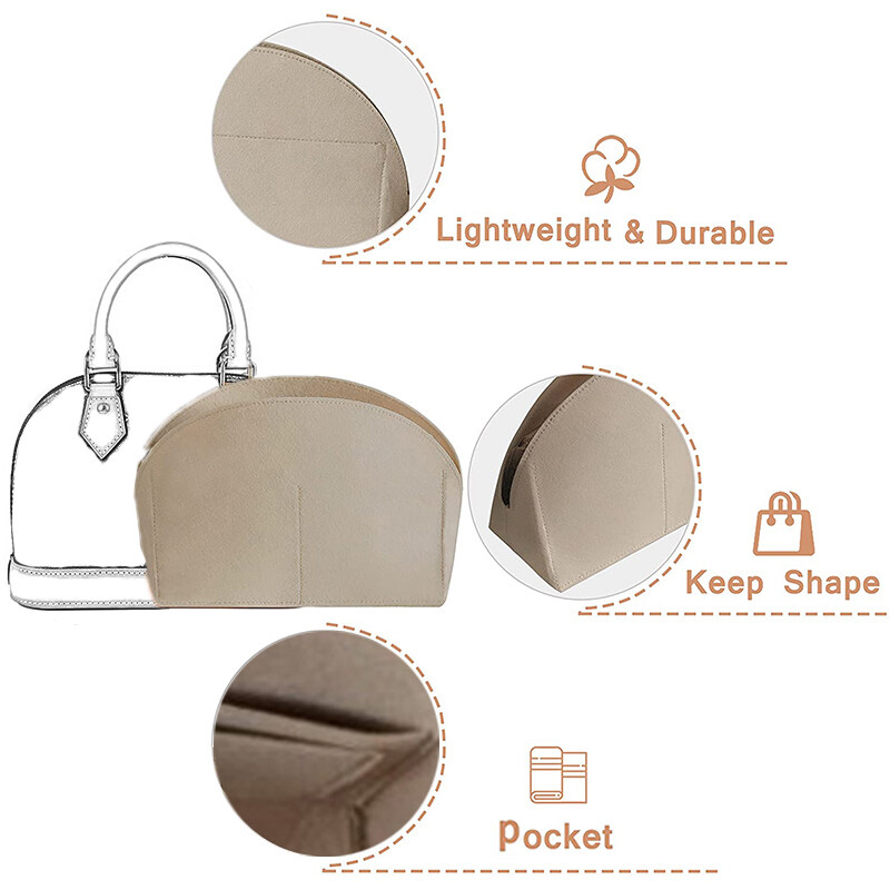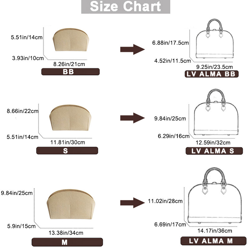 Felt Bag Organizer: Material:Made of premium Felt fabric. It is very Sturdy and light,protection. Size Guide: BB: 21 x 10 x 14 cm S: 30 x 14 x 22cm M: 34 x 15 x 25cm Note:If not for this series of products, you can choose the closest but not exceeding size!