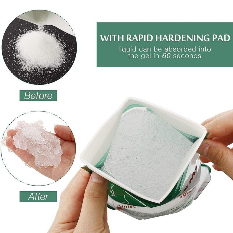 There are polymer water absorbing particles in the bag. Which could absorb urine, vomit or other liquid waste and turn it into an odorless, soft, spill-resistant gel.