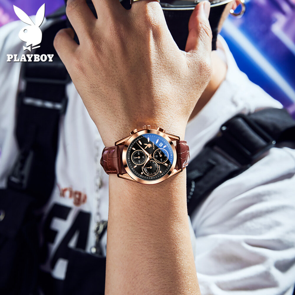 [Hot sale] PLAYBOY Watch For Men Original Waterproof 2022 Fashion Multifunction Dial Luxury Genuine Leather Strap Casual Mens Watch