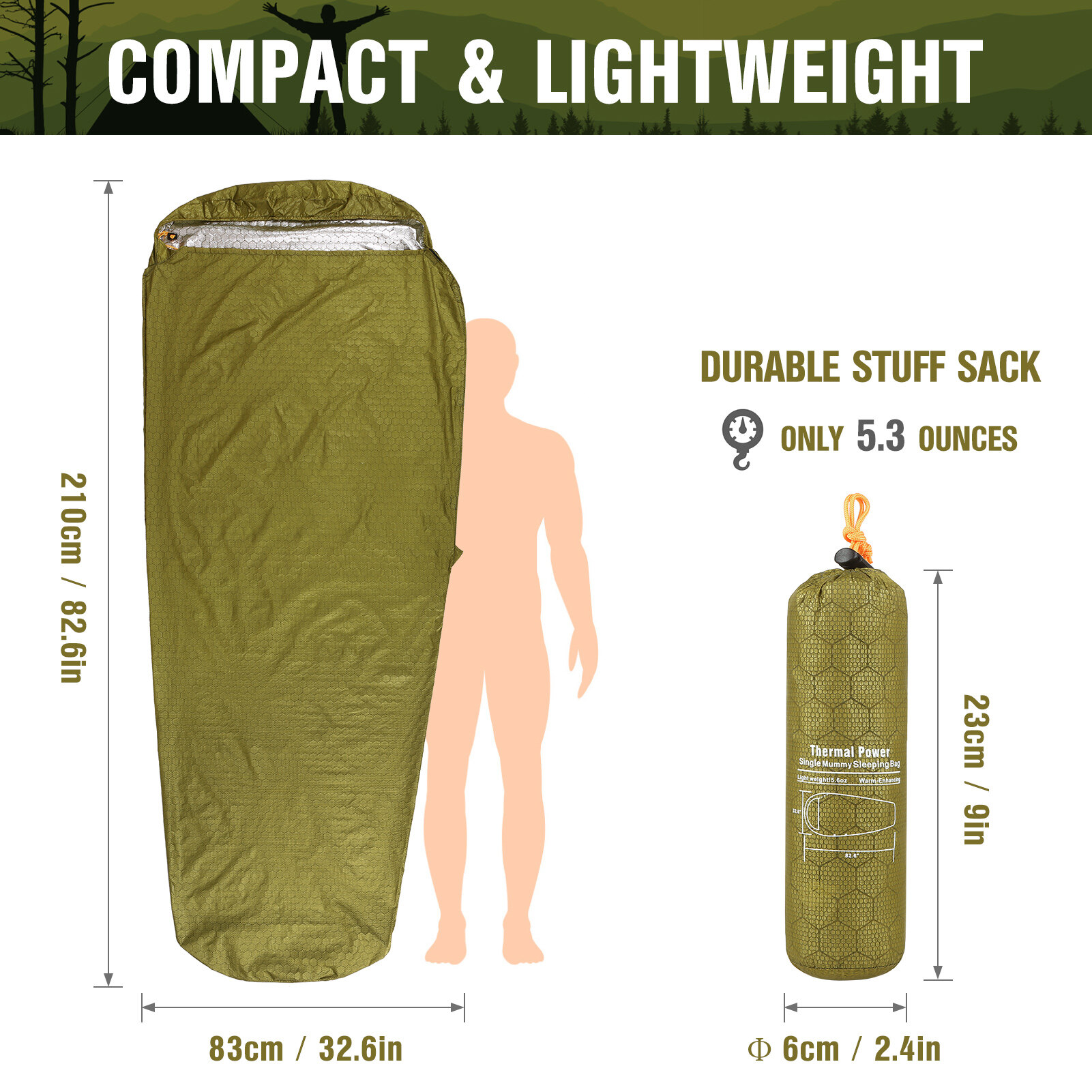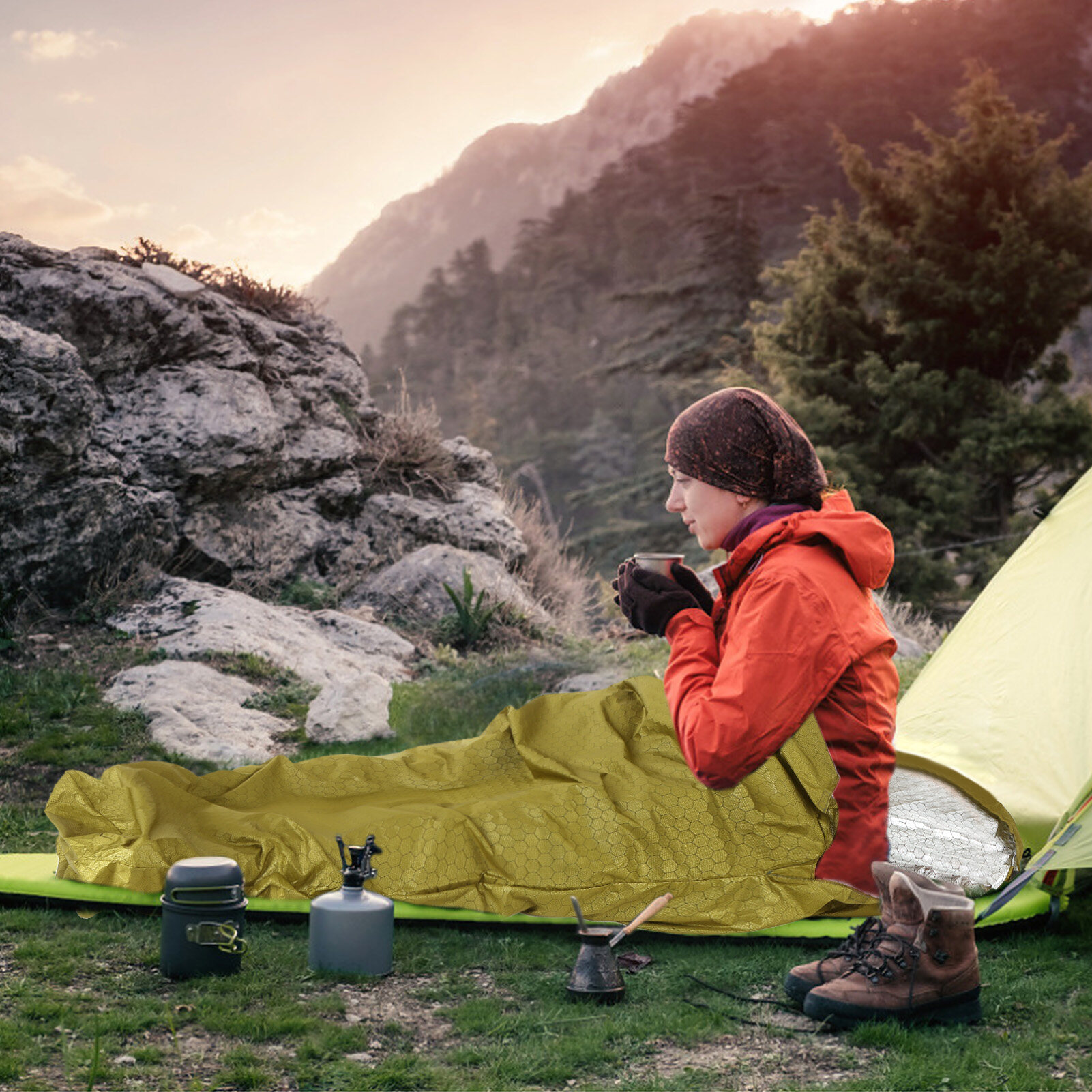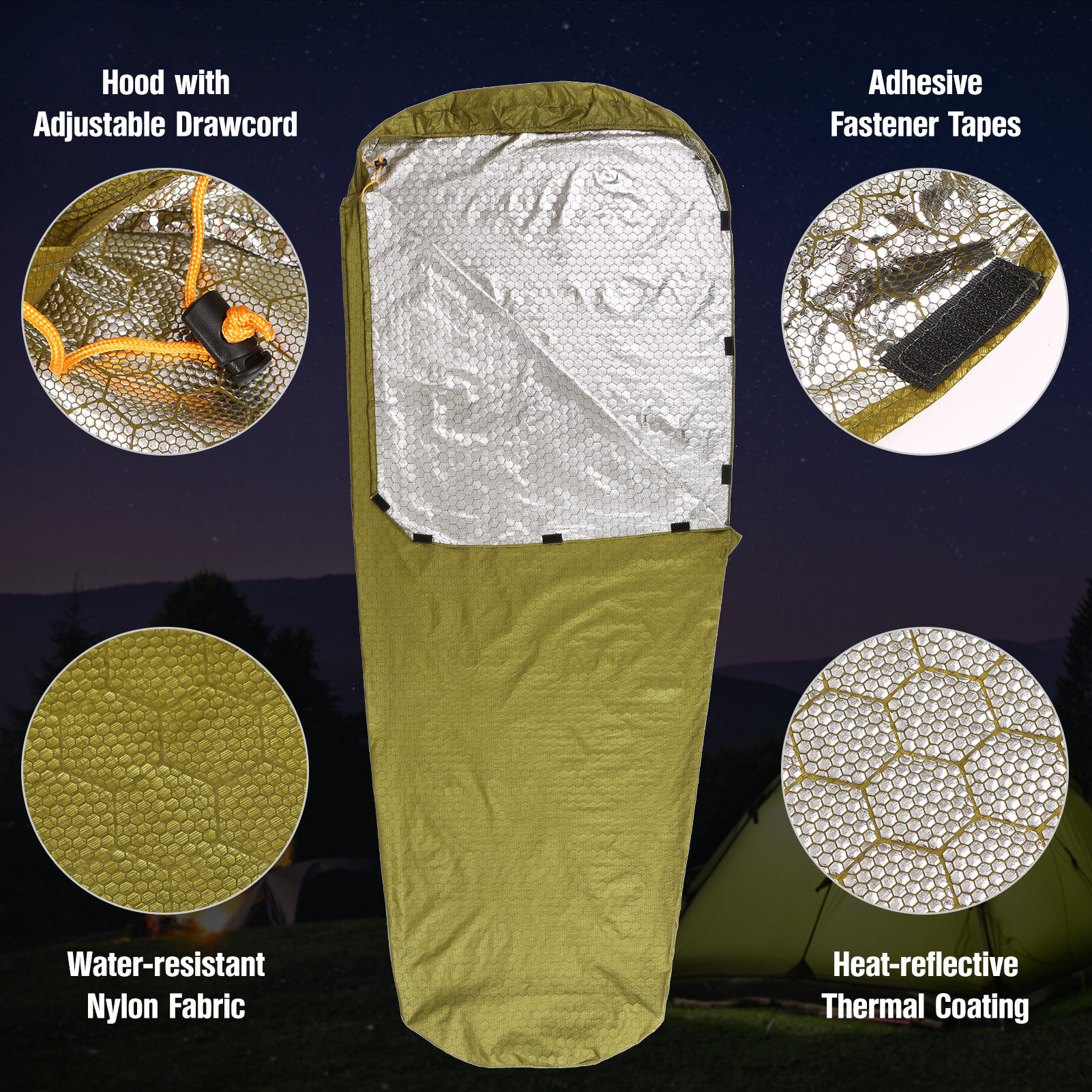 This emergency sleeping bag is made from water-resistant nylon shell fabric and heat-reflective aluminum inner coating to keep you warm in low temperature. It is lightweight and can be folded into a compact size for easy storage and carrying. It is perfect for camping, hiking, backpacking, outdoor adventure, survival, etc.
