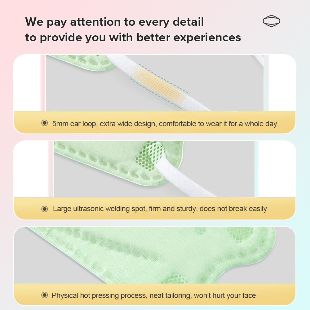 Structural composition: non woven fabric, melt down fabric, elastic band, polypropylene material