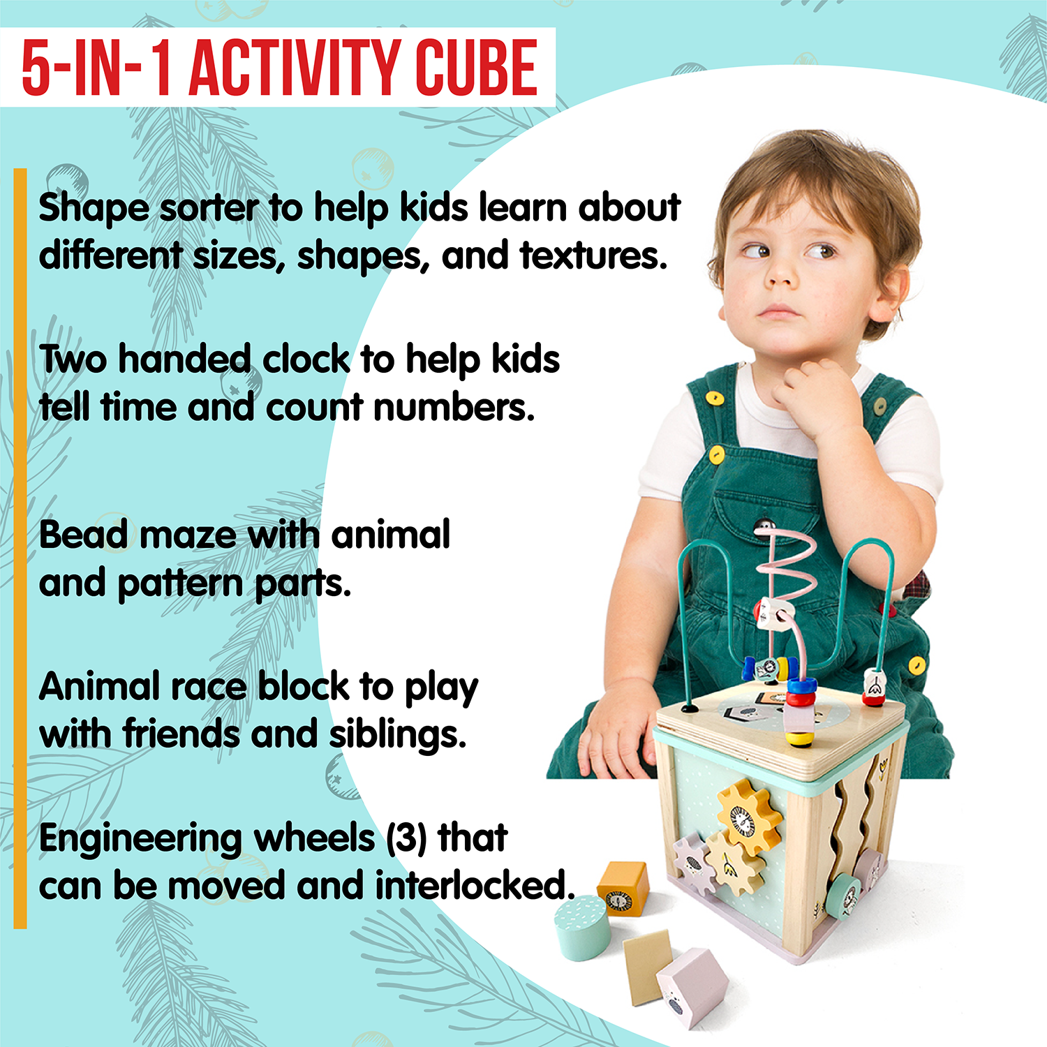 - PROMOTES PROBLEM-SOLVING AND CREATIVITY: Too many kids are staring at screens today, failing to create new games, scenarios, and solutions in their minds. With this wooden play cube, and 5-in-1 activity options available, watch your toddler solve puzzles and explore their imagination. This will help them develop self-esteem and confidence as they get older.