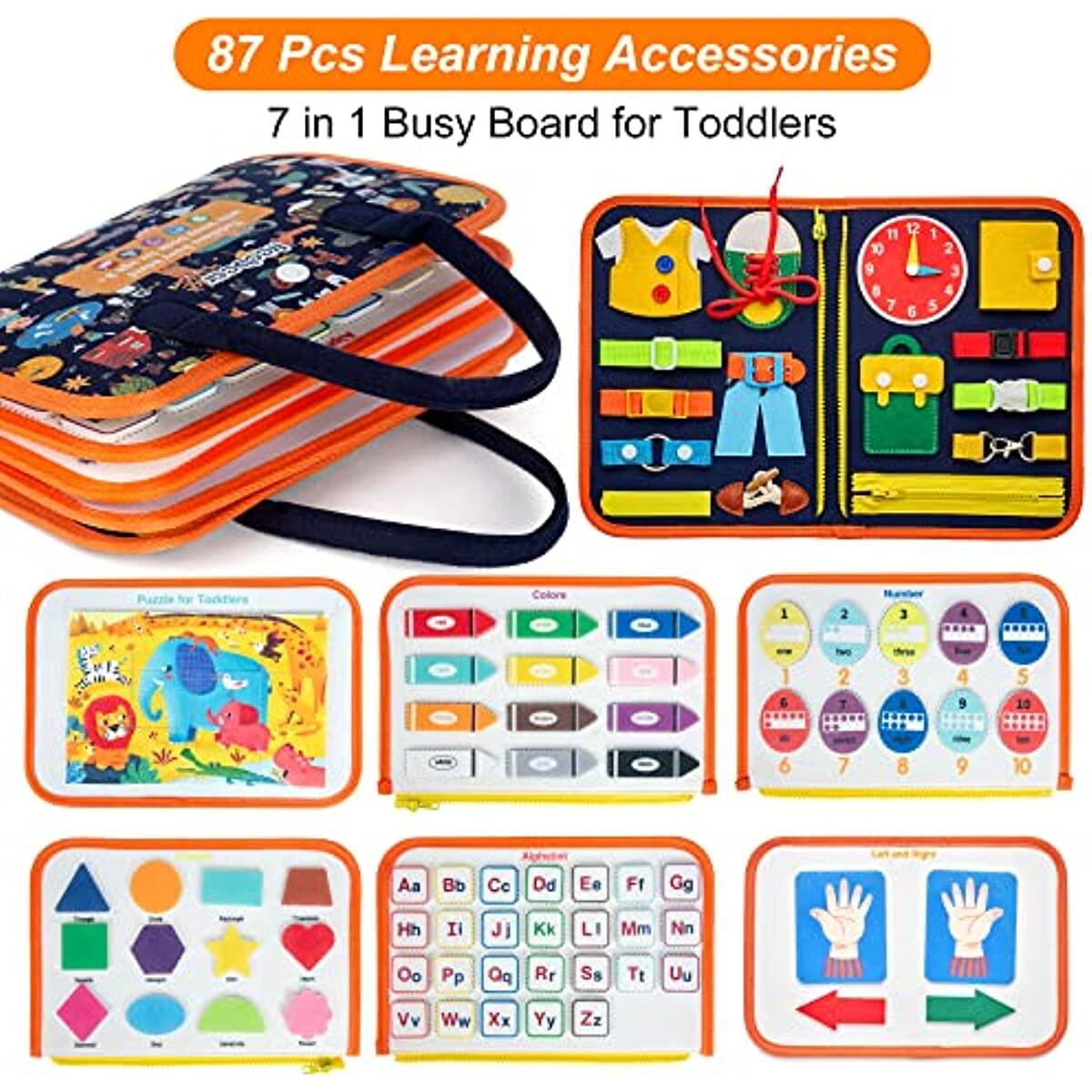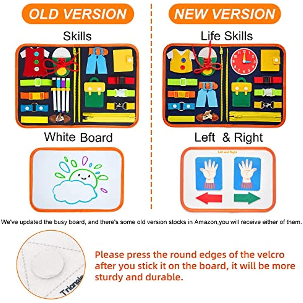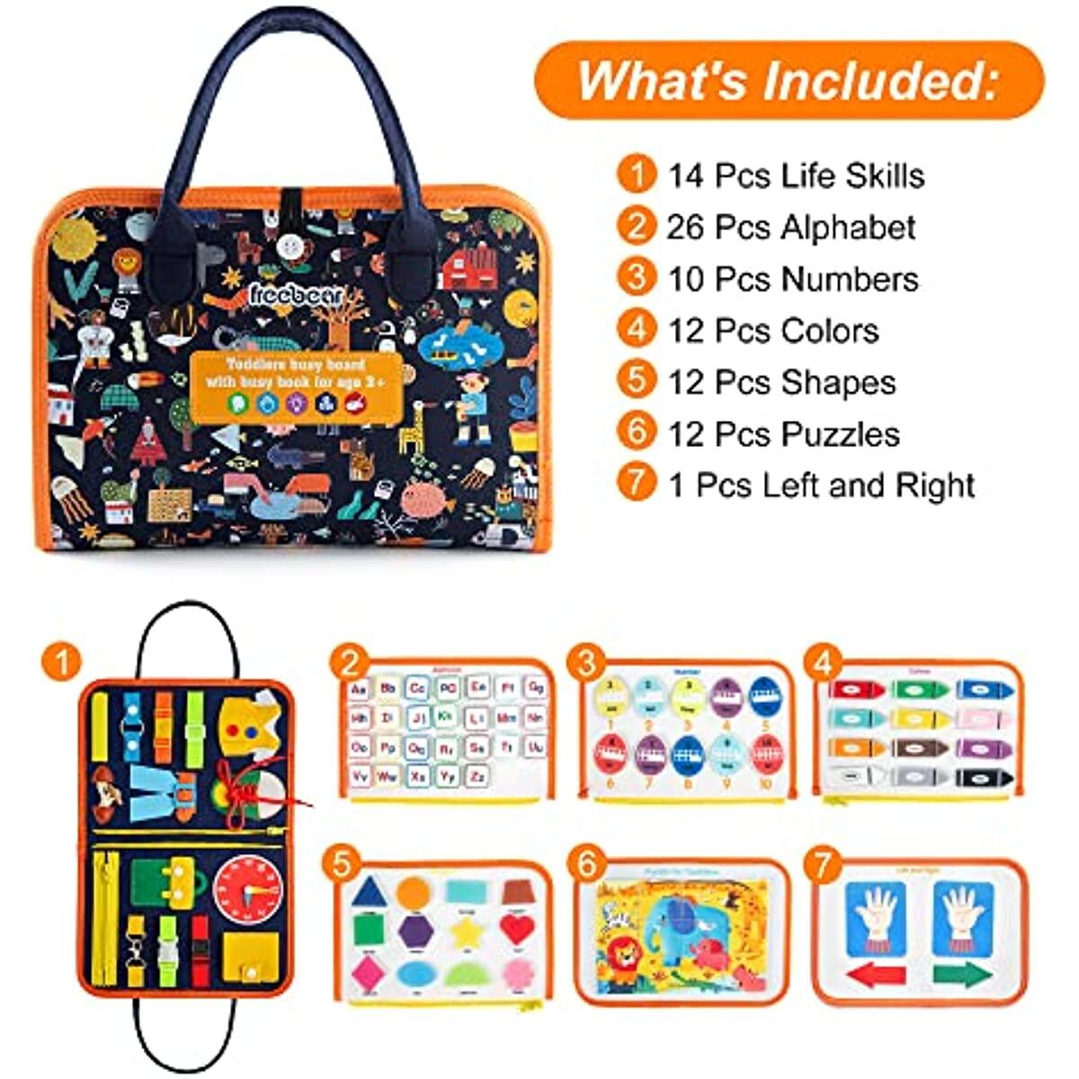 Busy Board is Here: Please press the round edges of the velcro after you stick it on the board, it will be more sturdy and durable.8 different theme on felt base with hand bag design. Alphabet, number, puzzle, colors, shapes, buckles, zip and white board. Markers with eraser are also prepared, each page is linked by zipper except white board page. Small parts are linked by hooks&loops.