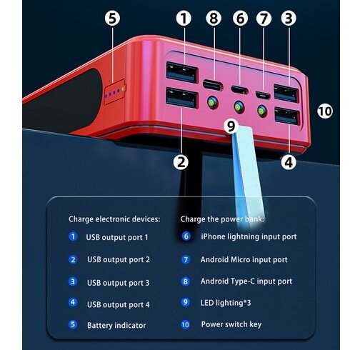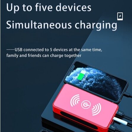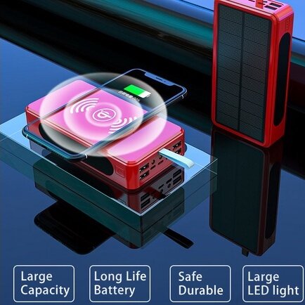 SHIP EVERYDAY!! ? 100% Original Product ? Follow our shop, you can receive a coupon ✅Battery Type: Li-polymer Battery ✅Features: with Solar Panel ✅Features: with Flashlight ✅Features: wireless charging ✅Output Interface: Four Usb ✅Output Interface: Wireless ✅Battery Capacity: 80000mAh ✅Charging Devices: for Tablet ✅Charging Devices: for Drones ✅Charging Devices: for Camera ✅Charging Devices: for Smartphone ✅Input Interface: Micro Usb ✅Input Interface: USB Type C ✅Input Interface: Apple Interface ✅Shell Material: Plastic ✅Type: Portable Power Bank ✅Weight: 420g ✅Size: 15 Warm remind: 1. Please charge it under STRONG sunlight, do not charge it in cloudy day or the place through glass(e.g a window or car) 2. Solar charging is designed for emergencies, not a primary source of charging due to the compact solar panel size and sunlight intensity, it could take 21 hours under direst strong light to fully charge(there are 7-8 hours of sunlight per day). So we highly recommend charge the solar charger via an adapter or computer, which only take a few hours 3.Normally, it can reach 25% battery after 5 hours recharge under strong sunlight, so only the first light will on 4. The water drops are good, but please don't immerse in the water for too long. Introduction: Suitable for tablets and mobile phones, regardless of Android and IOS systems After the refusal to go abroad, the dilemma that mobile phones and tablets cannot be charged because the charging head is not suitable 1. Original warranty company goods 2. Provide perfect after-sales service, do not reply after refusing to sell 3. Years of seller quality assurance 4. Providing lifetime warranty is our greatest sincerity 5. If you have any questions, please talk to us, no matter the product quality or express delivery, we will give you the best service 6. Super LED lights, no need to worry about the night Question: Q:How long does it take to fully charge the power bank? A:one night Q:How many times can the mobile phone be charged by the power bank once it is fully charged? A:8 to 12 times Q:What are the functions of this power bank? A:This power bank can be charged wirelessly, wiredly, and solar powered Q:Is the power bank waterproof? A:waterproof Q:How long does solar charging take to fully charge the phone? A:Solar charging is an emergency charging. Because the solar energy is relatively small and cannot meet the power supply demand of the power bank, the charging speed is slow