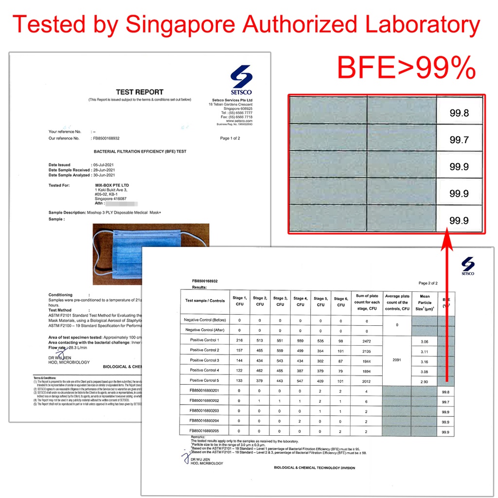 Every batch of our masks are sent to Singapore authorized laboratory to test to ensure safe requirement Ment of BFE>95%
