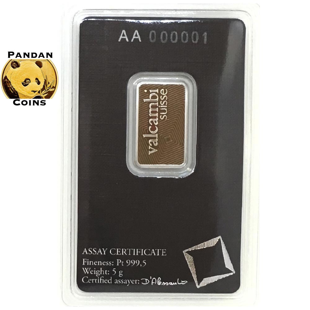 Valcambi 9995 Platinum Bar 5g, 5 gram Country: Switzerland Manufacturer: Valcambi Purity: 0.9995 Platinum Weight: 5 gram