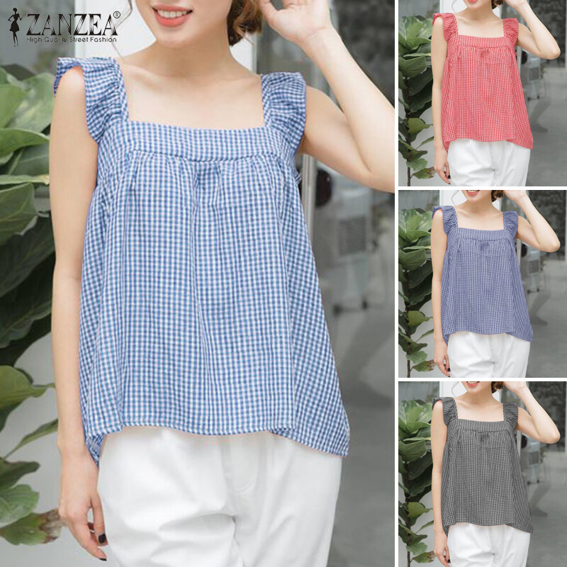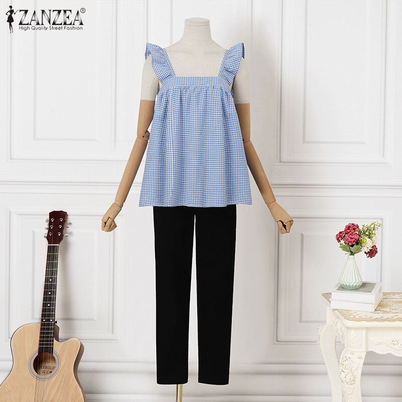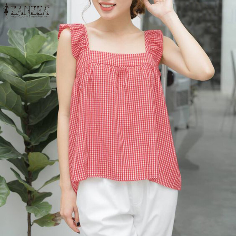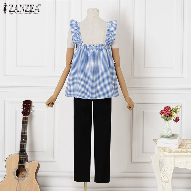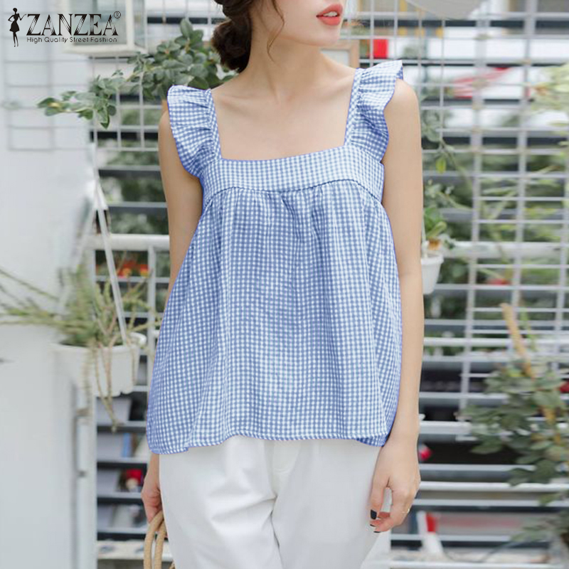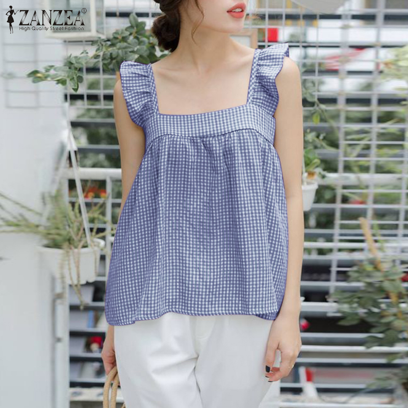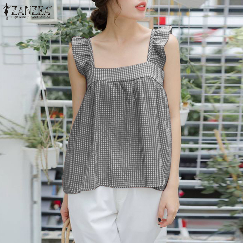 HijabFab ZANZEA Korean Style Women Blouse Versatile Geometric Printed Camisoles Loose Sleeveless Tanks Ruffle Tops #10