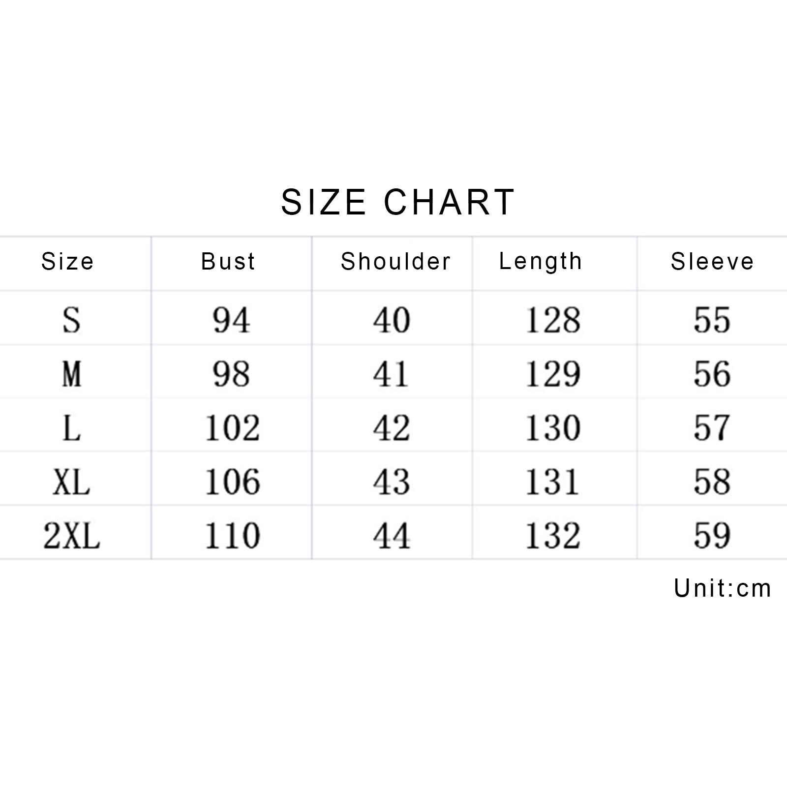 2XL Length: 132 Bust: 110 Sleeve Length: 59 Shoulder: 44