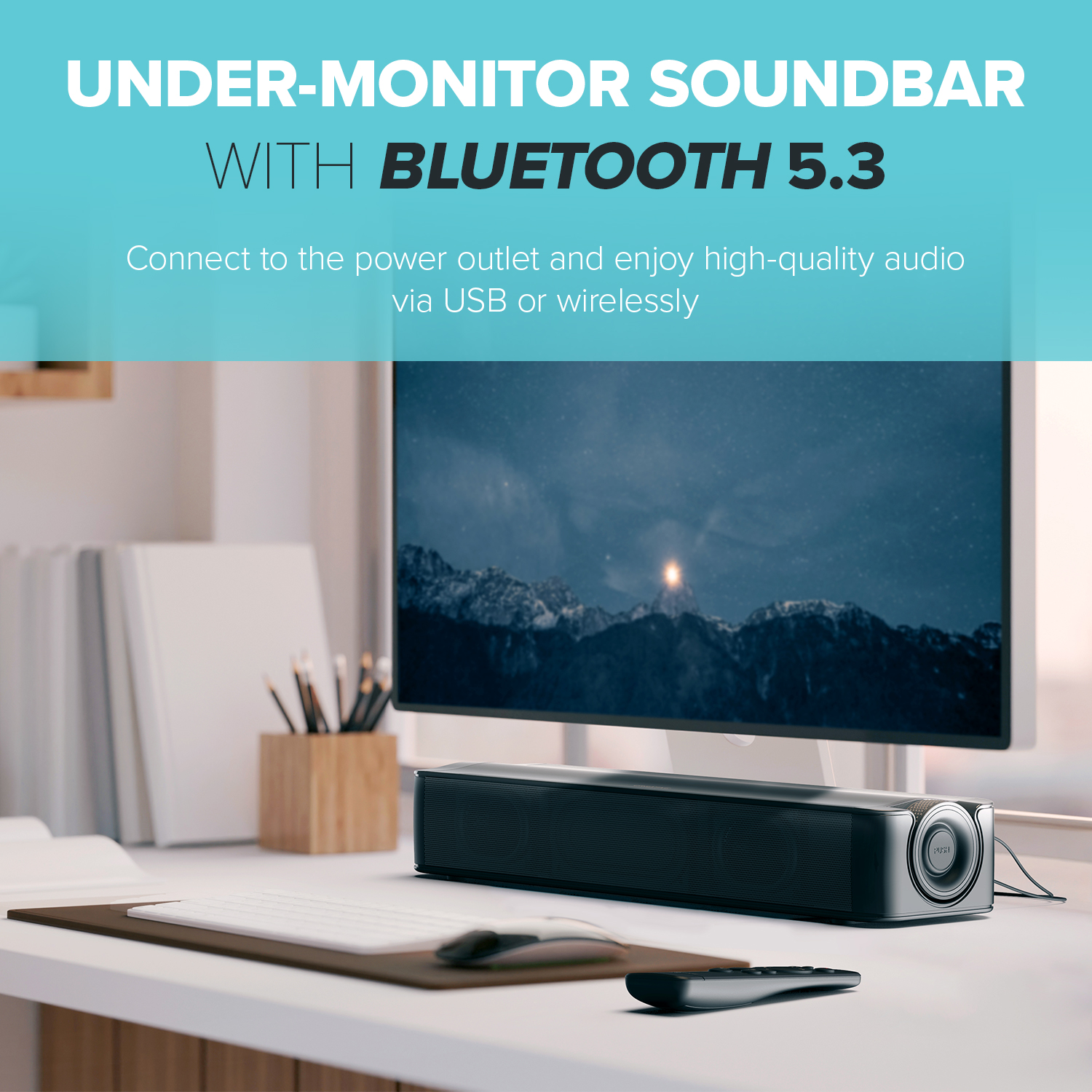 The Creative Stage SE powers up via a power adapter and connects to your computer with a single USB cable or wirelessly with Bluetooth 5.3. Its small footprint also allows for flexible placement under the monitor and well suited for smaller rooms. Plus, the soundbar is easy to set up and control, with the multi-functional knob conveniently located at the side of the soundbar for easy reach to power on or adjust volume.