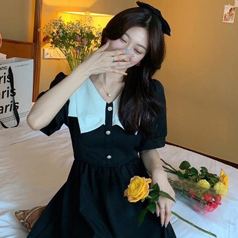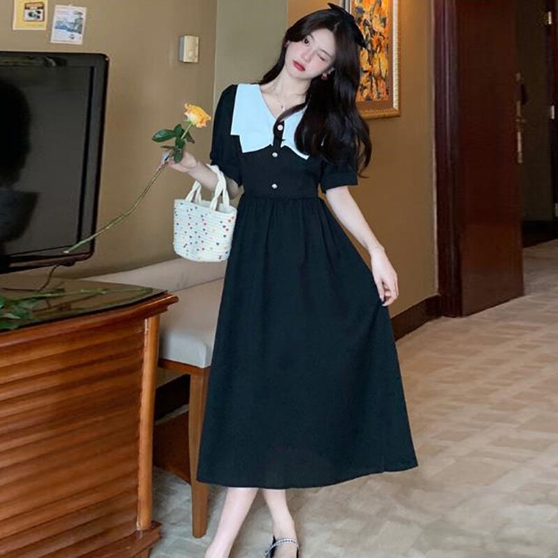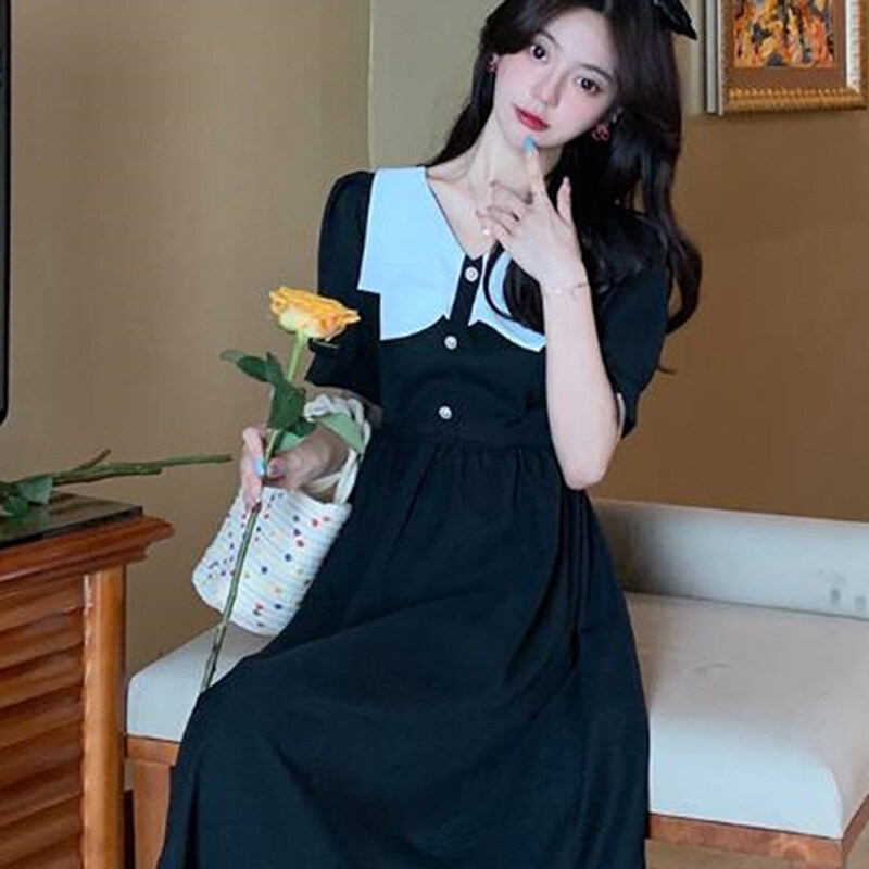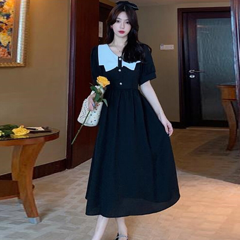 Littlegroot [2023 new HOT FASHION] Dresses Women Short Sleeve Patchwork French Midi Stylish Peter Pan Collar High Waist Elegant Dress