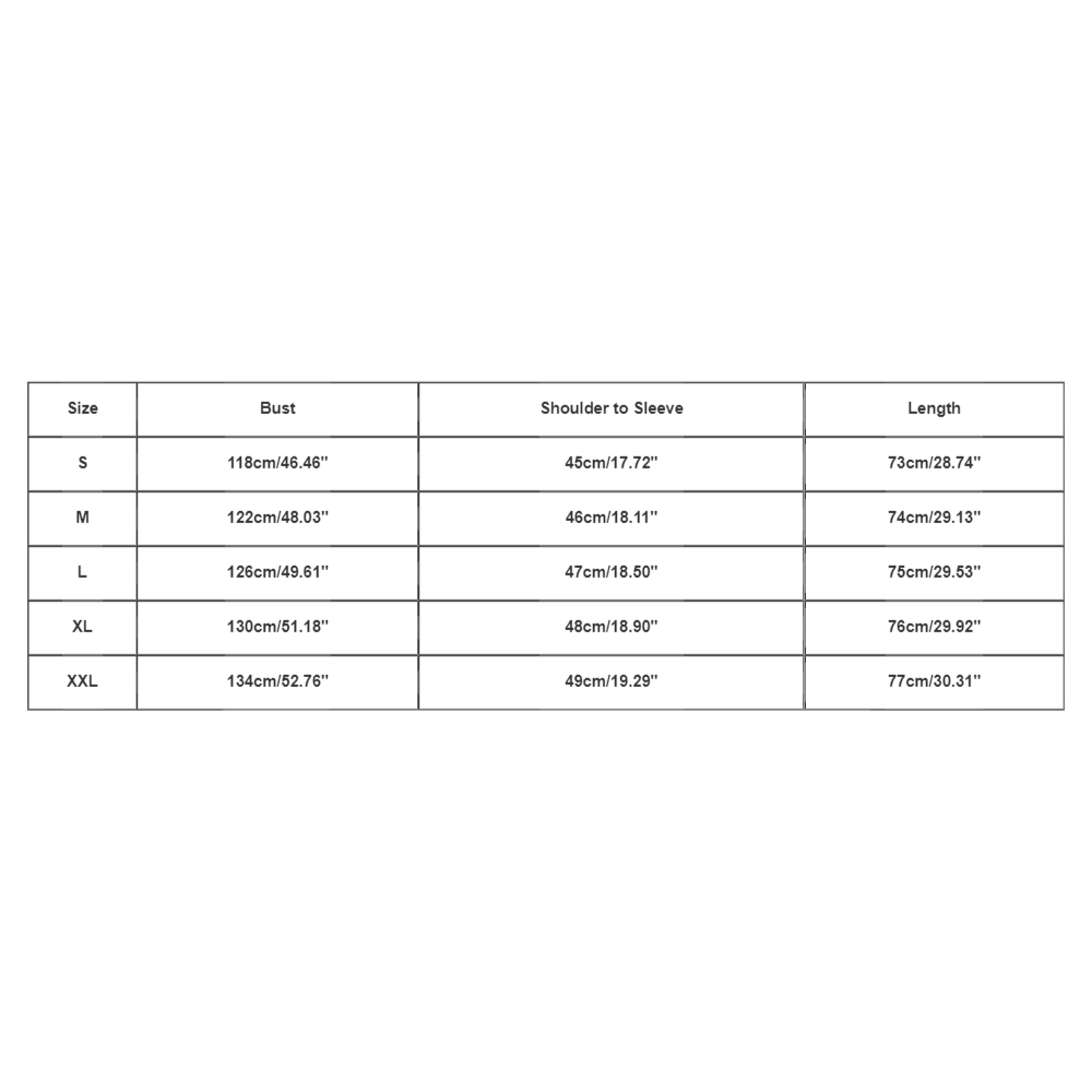Size:XLBust:130cm/51.18''Shoulder to Sleeve:48cm/18.90''Length:76cm/29.92''