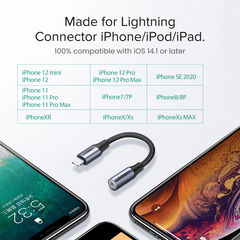 UGREEN MFI Lightning to 3.5mm Jack AUX Cable Made for iPhone 13 / iPhone SE2/12/11/XR/XS/XS MAX/8Plus/8/iPhone 7 Plus/iPad Air/Pro 3.5mm Lightning 3.5 MFI Headphones Audio Adapter Splitter
