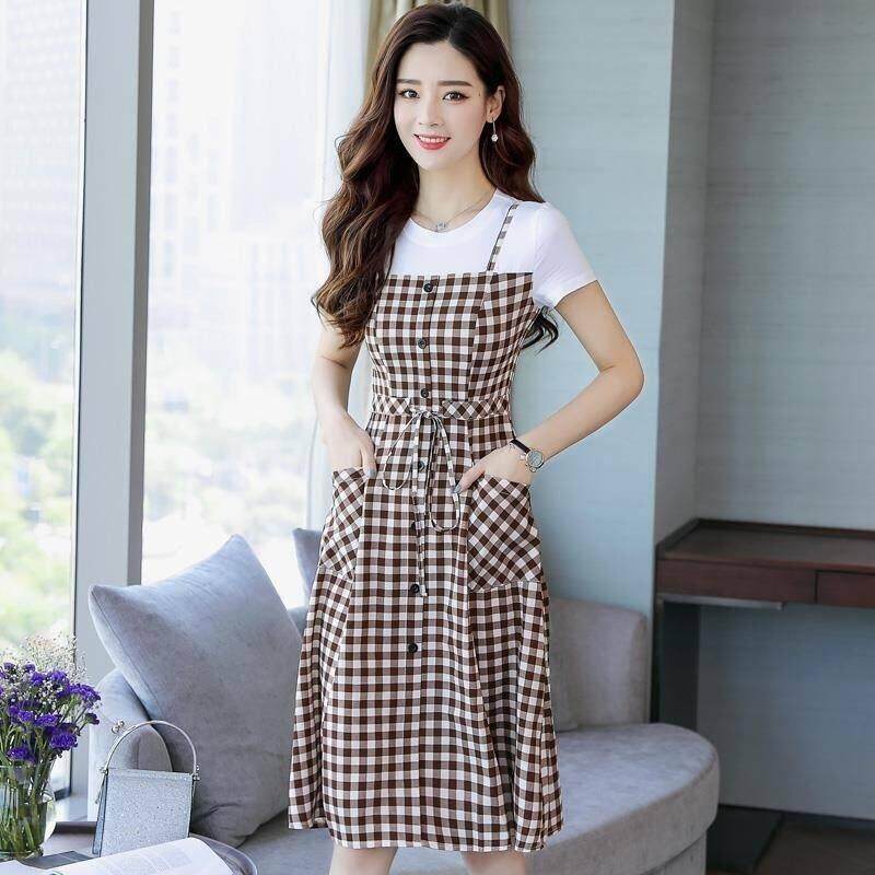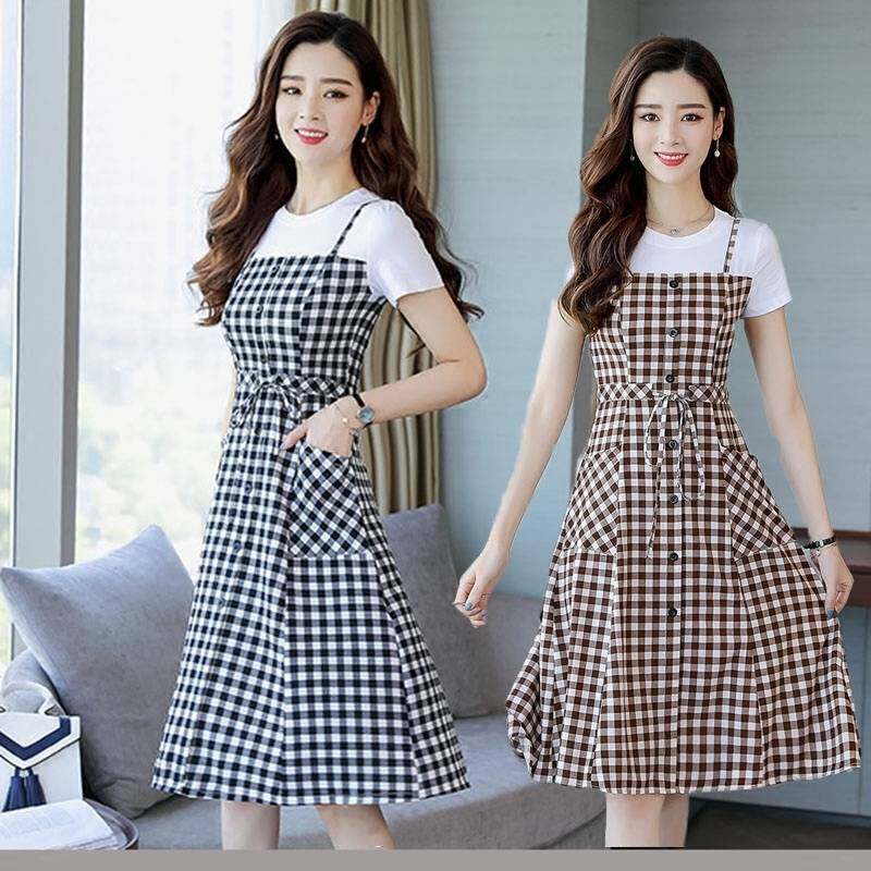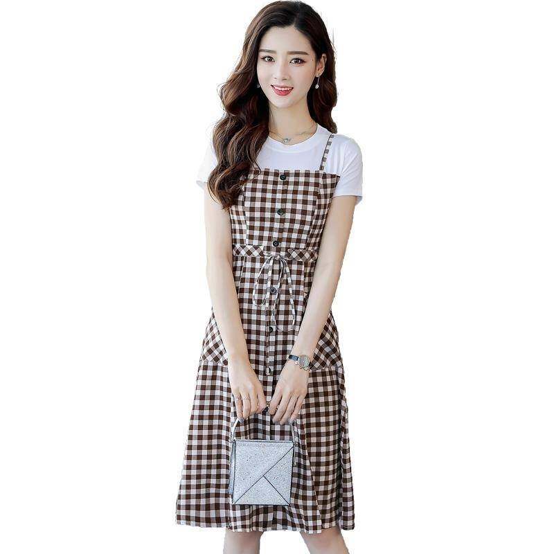 Cotton T suspender plaid splicing dress female summer fake two A-line skirt