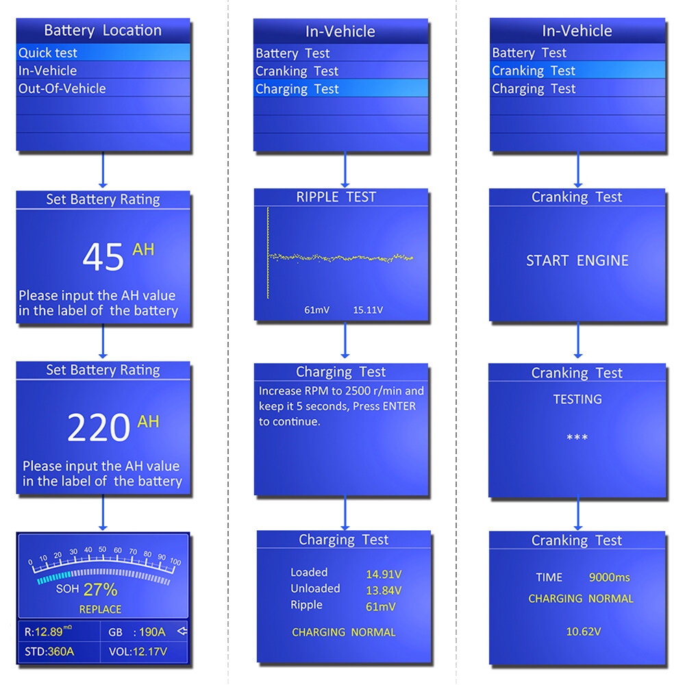 The capability of the battery and the aging extent, which provide reliable analysis evidence for the test and maintenance of the battery. Ancel BA201 notifies the users to replace battery in advance when the battery getting aged