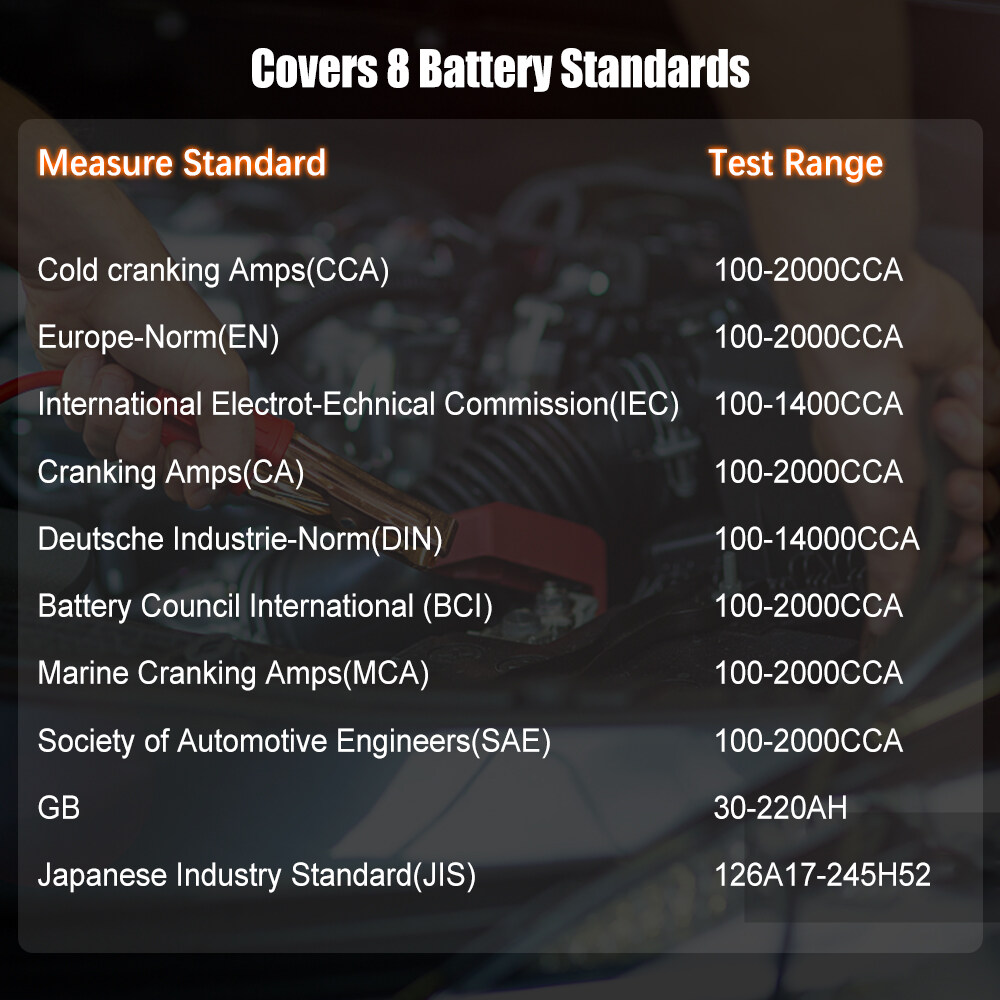 9. Testing standards include currently the world's majority of battery standards, CCA, BCI, CA, MCA, JIS, DIN, IEC, EN, SAE, GB.