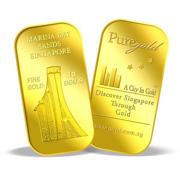 The image of Marina Bay Sands is embossed on a 1g 999.9 fine gold bar.